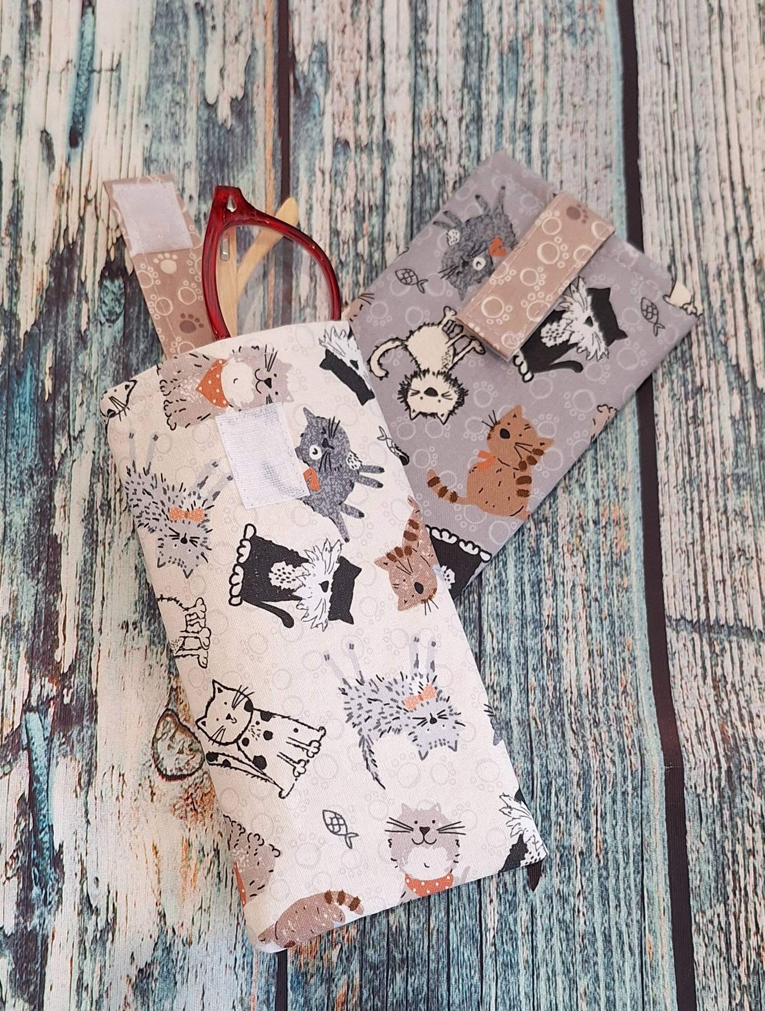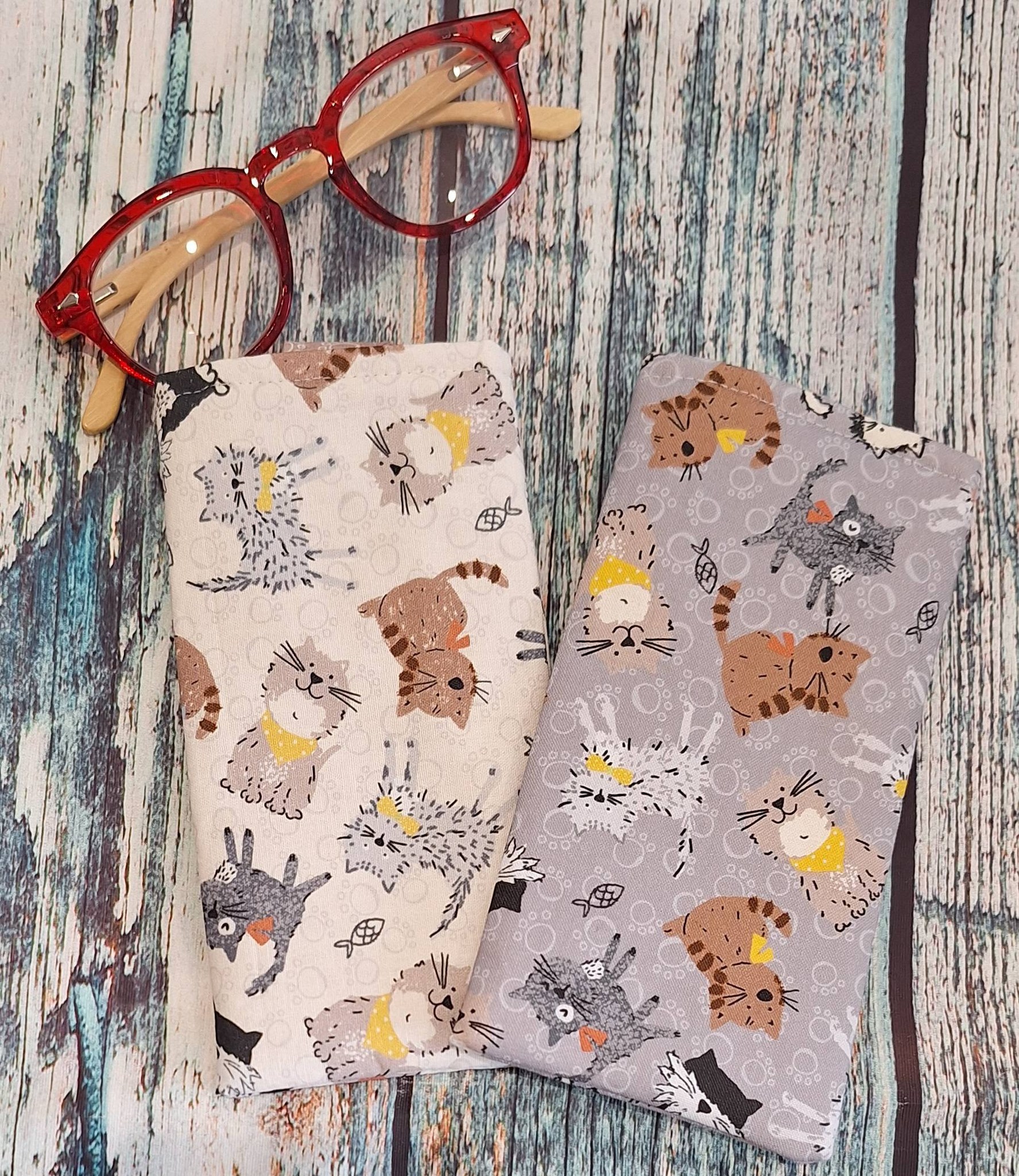 Other fabrics availableThe outer fabric is a printed cotton with crazy cat design lined with a contrasting cotton and wadding is built in to give your glasses protection....