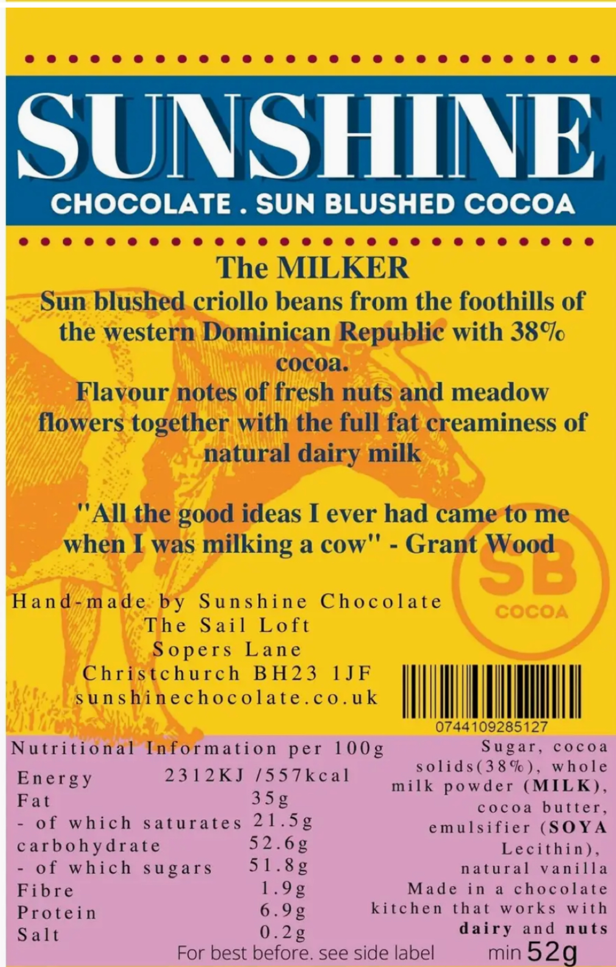 The Milker Dominican Sun Blushed Cocoa Choc Bar Made By Sunshine Chocolate